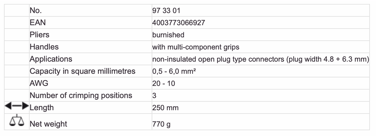 Crimping pliers with round magazine and three interchangeable crimping dies for non-insulated open plug type connectors (4.8 + 6.3 mm width) from 0.5 - 6.0 mm²; for insulated terminals, plug connectors and butt connectors from 0.5 - 6.0 mm² and for insulated and non-insulated end sleeves (ferrules) from 0.25 - 6.0 mm²