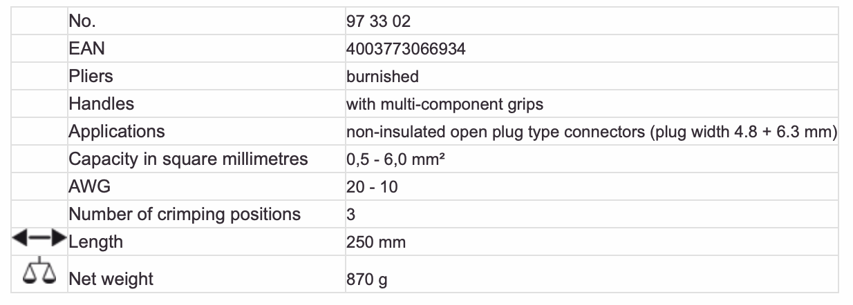 Crimping pliers with round magazine and five interchangeable dies for non-insulated open plug type connectors (plug width 4.8 + 6.3 mm) from 0.5 - 6 mm²; for insulated terminals, plug connectors and butt connectors from 0.5 - 6 mm²; for insulated and non-insulated end sleeves (ferrules) from 0.25 - 6 mm²; for insulated and non-insulated end sleeves (ferrules) with 10 / 16 / 25 mm² and for non-insulated crimp terminals. tube and compression cable lugs in accordance with DIN 46234 and DIN 46235 and non-insulated crimp, butt and press connectors in accordance with DIN 46341 and DIN 46267