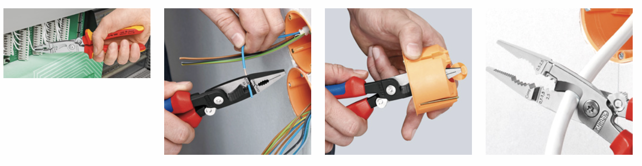 - คีมอเนกประสงค์สำหรับงานติดตั้งระบบไฟฟ้า, ใชยึดจับวัสดุที่แบนและกลม, สำหรับการดัดงอ, การลบเสี้ยน, การตัดสายไฟหรือสายเคเบิ้ล, การปอก และการย้ำปลอกปลาย (เฟอร์รูล)