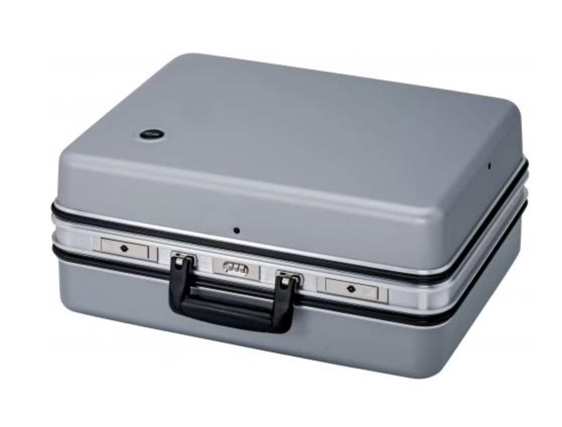 Sturdy metal locks and three-digit combination lock protect the contents of the case